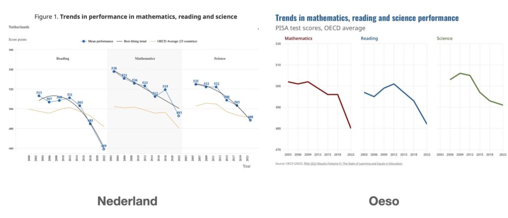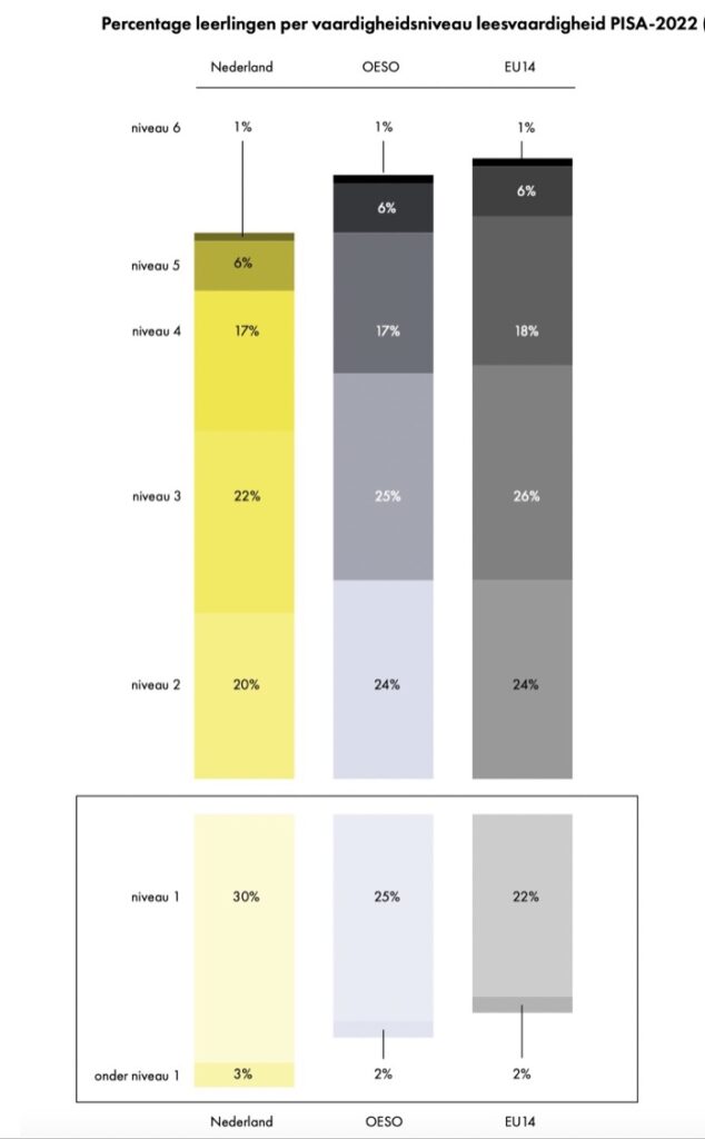 Voor leesvaardigheid daalde Nederland binnen 26 EU landen (Luxemburg heeft niet meegedaan) van de 14de plaats in 2018 naar de 20ste plaats in 2022. Voor Natuurwetenschappen liep de Nederlandse positie terug van 5 naar 13. Op het gebied van rekenen/wiskunde is het beeld totaal anders. In 2018 scoorde Nederland de 2de plaats. In 2022 was dat opnieuw de 2de plaats. De alarmerende verhalen over taal zijn niet ongegrond. Voor rekenen is wel sprake van een daling, maar Nederland doet het nog steeds goed bij rekenen in de Pisa toets.