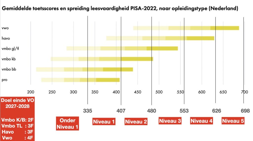 In het Masterplan Basisvaardigheden zijn doelen voor het schooljaar 2027-2028 geformuleerd. Zet je die af tegen de scores in Pisa 2022 dan is er voor alle stromen werk aan de winkel. Wat te doen voor bijvoorbeeld leesvaardigheid? Vrijwel iedereen is het erover eens dat er meer inzet gepleegd moet worden op leesplezier. Daarvoor moet de technische tekstaanpak van het ‘begrijpend lezen’ overboord. Als je wilt weten waarom kijk dan even naar dit filmpje van Arjen Lubach:
